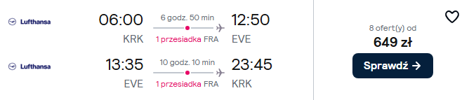 Do Norwegii wybierzesz się dopiero w trakcie przyszłorocznych wakacji, w terminie 20 – 27 lipca. Do Evenes polecisz Lufthansą z jednego z 5 miast w Polsce (szczegóły poniżej). Po drodze przesiądziesz się we Frankfurcie.