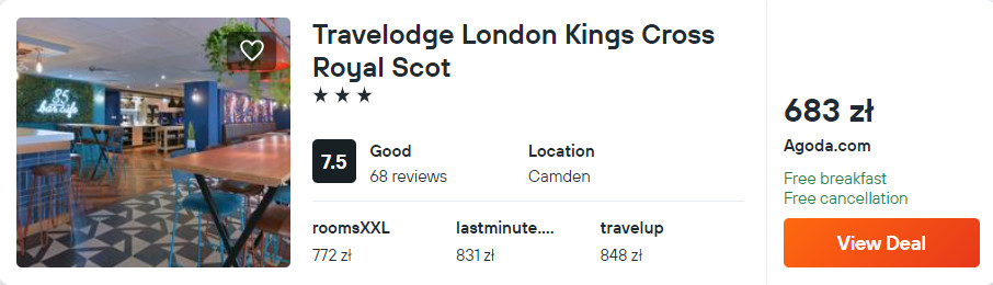 W Londynie proponuję ci nocleg ze śniadaniem w 3* hotelu Travelodge London Kings Cross Royal Scot. Każdy pokój wyposażony został w klimatyzację, telewizor LCD oraz czajnik elektryczny. W łazience jest prysznic, suszarka do włosów oraz podstawowe przybory toaletowe. Na terenie całego obiektu będziesz mieć zapewniony dostęp do sieci WiFi.