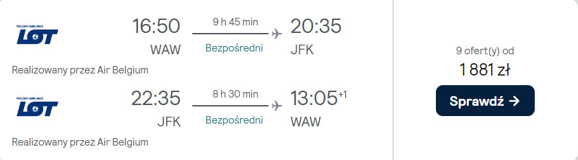 Warszawa – Nowy Jork (lotnisko JFK) – Warszawa »
