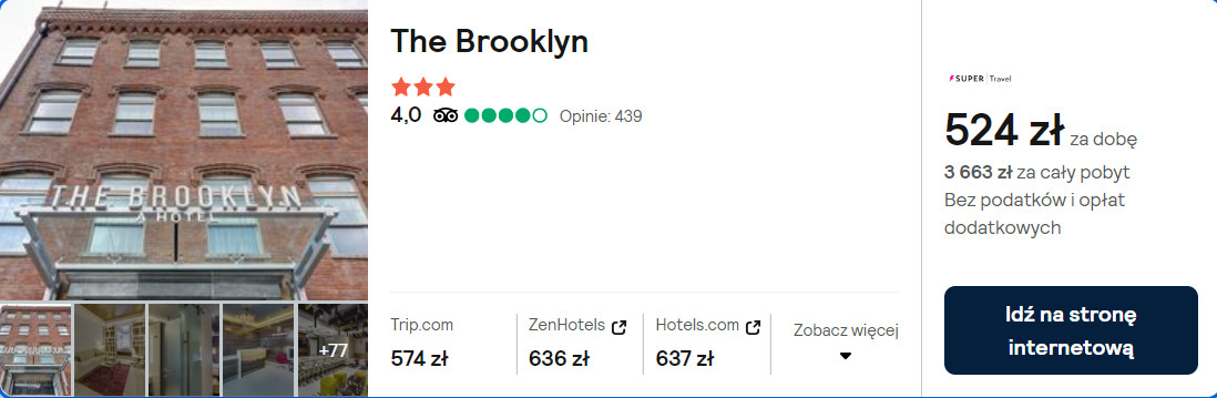 Natomiast w Nowym Jorku proponuję ci noclegi w 3* hotelu The Brooklyn. Każdy pokój wyposażony został w klimatyzację z funkcją ogrzewania, lodówkę, kuchenkę mikrofalową, zestaw do parzenia kawy lub herbaty oraz telewizor LCD. W łazience jest prysznic, suszarka do włosów, a dla gości przygotowano podstawowe przybory toaletowe.