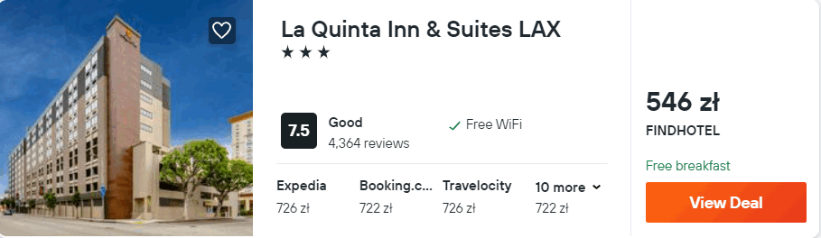 W Los Angeles proponuję wam noclegi ze śniadaniami w 3* hotelu La Quinta Inn & Suites LAX. Wszystkie pokoje są klimatyzowane i wyposażone w telewizor LCD, minibar oraz zestaw do parzenia kawy lub herbaty. W każdej łazience jest wanna z prysznicem. Na terenie całego obiektu będziecie mieli zapewniony dostęp do sieci WiFi.