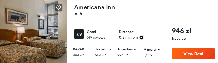 W Nowym Jorku proponuję wam noclegi w hotelu Americana Inn, który znajduje się na Manhattanie. Każdy pokój wyposażony jest w klimatyzację z funkcją ogrzewania oraz telewizor. Na terenie całego obiektu będziecie mieć zapewniony dostęp do sieci WiFi.