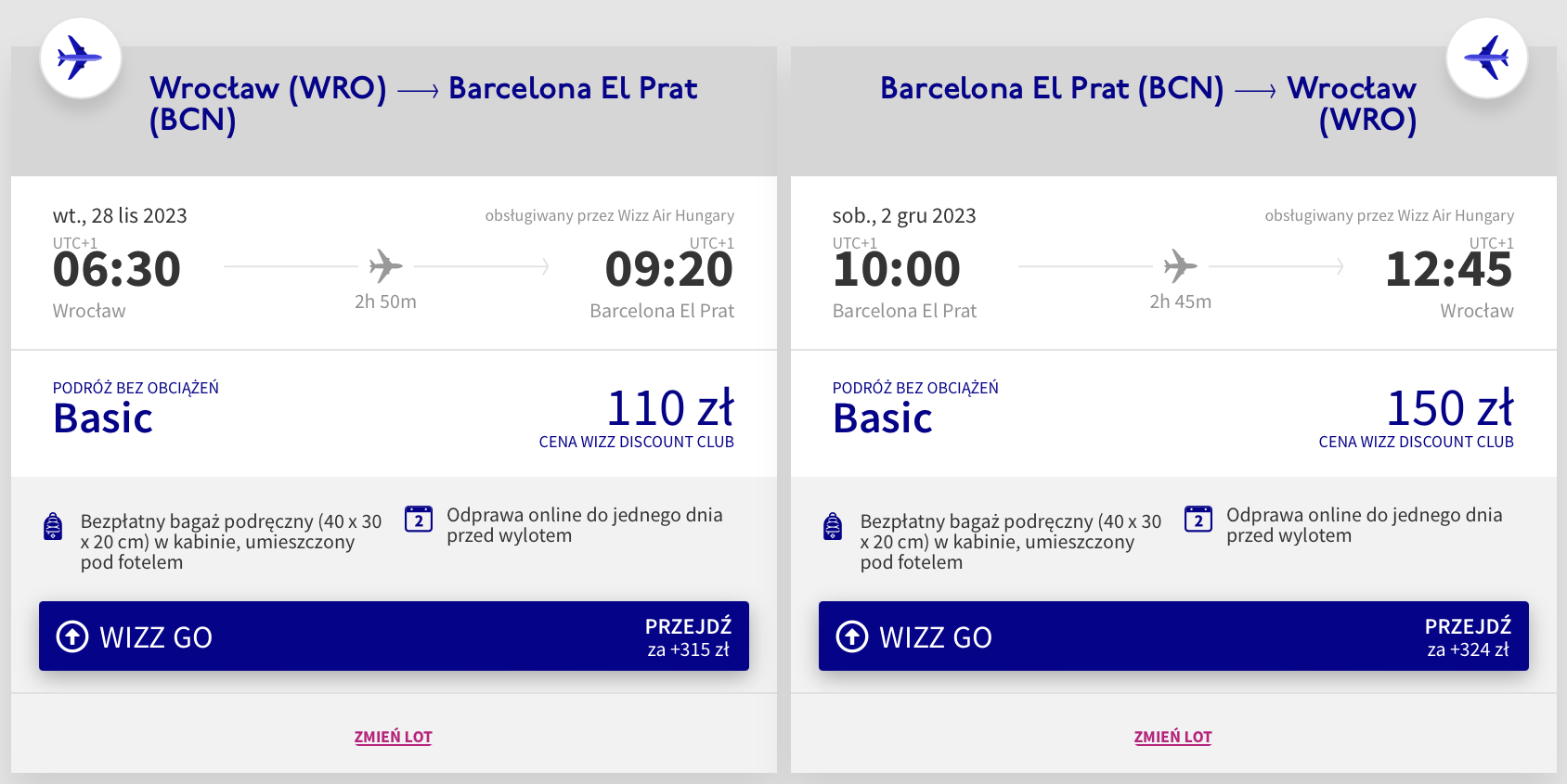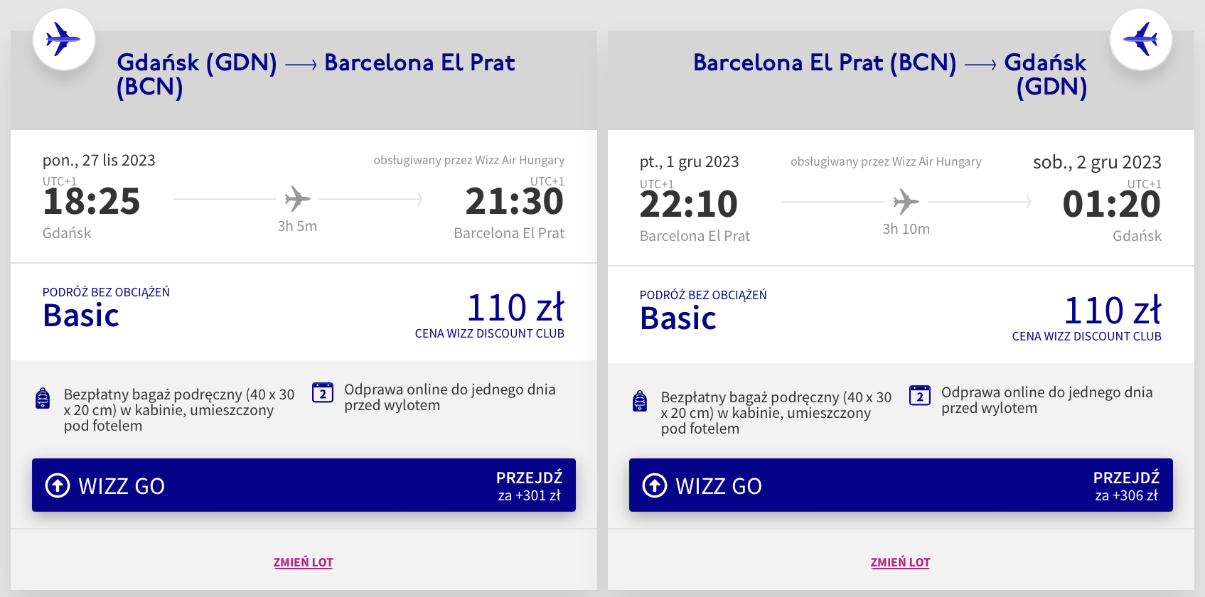 Do Hiszpanii udasz się z gdańskiego portu lotniczego im. Lecha Wałęsy lub wrocławskiego portu lotniczego im. Mikołaja Kopernika. W obie strony polecisz na pokładzie samolotu linii Wizz Air. Bilety w najniższej cenie dostępne są dla członków Wizz Discount Club. Chętni na loty bez WDC zapłacą nieco więcej.