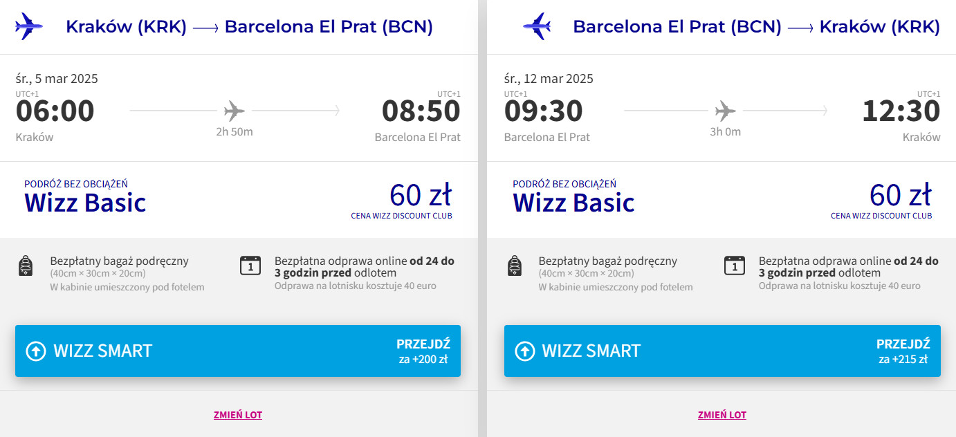 Do Barcelony udasz się z portu lotniczego Kraków-Balice w terminie 5-12 marca. W obie strony podróżować będziesz bezpośrednio linią Wizz Air. Bilety w najniższej cenie dostępne są dla członków Wizz Discount Club. Chętni na loty bez WDC zapłacą więcej.