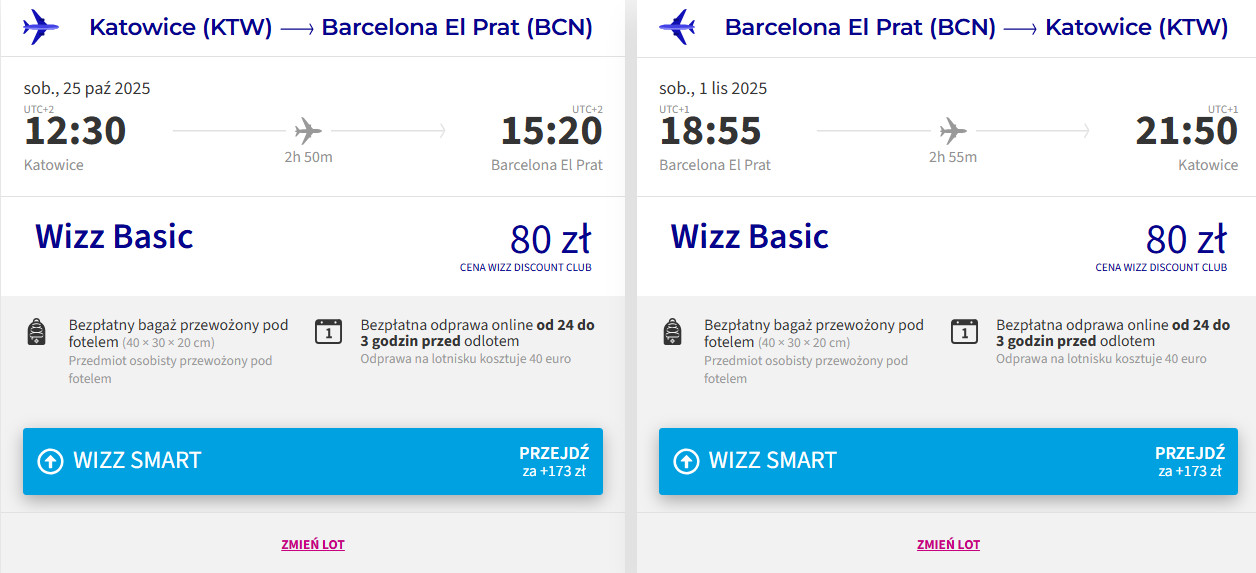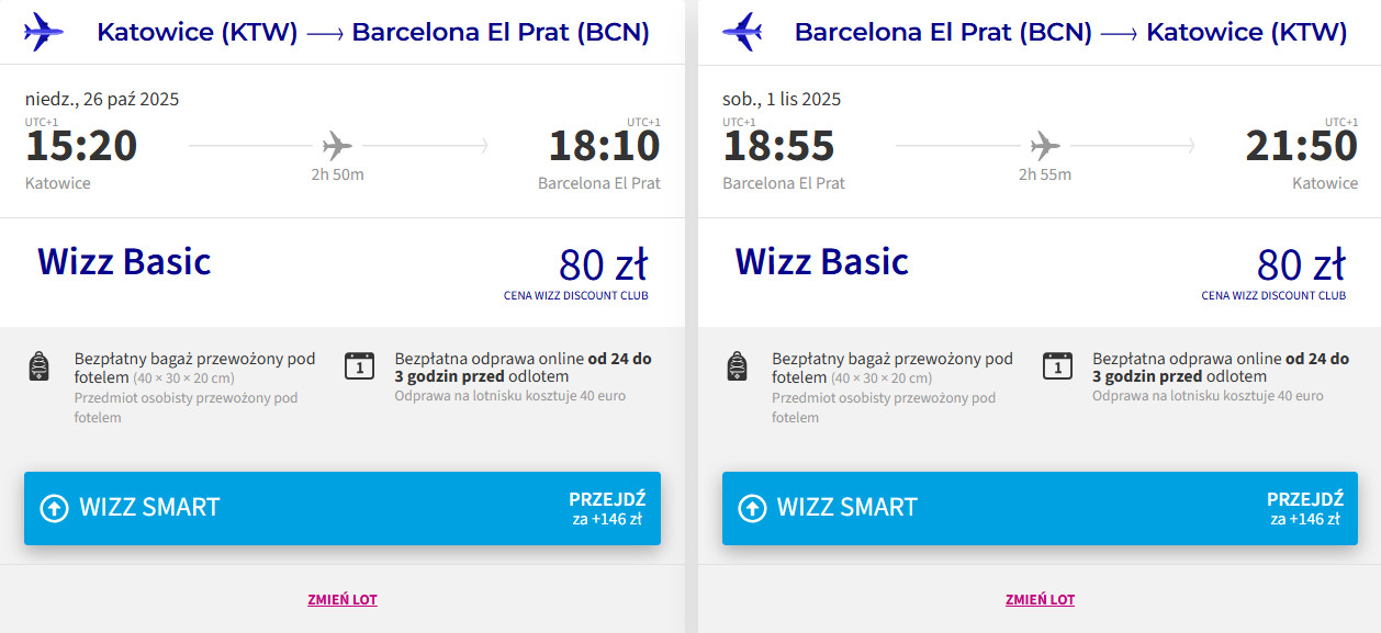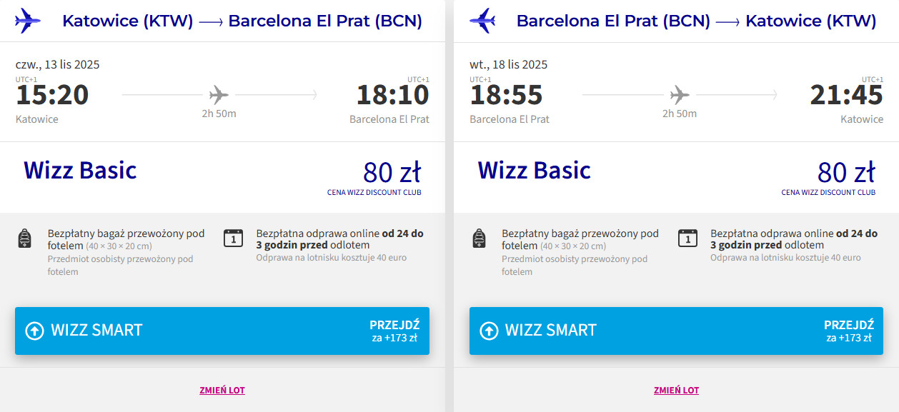 Do Barcelony polecisz bezpośrednio z Katowic. W obie strony podróżować będziesz linią Wizz Air. Pamiętaj, że bilety w najniższej cenie dostępne są dla członków Wizz Discount Club. Chętni na loty bez WDC zapłacą 258 PLN (w obie strony).