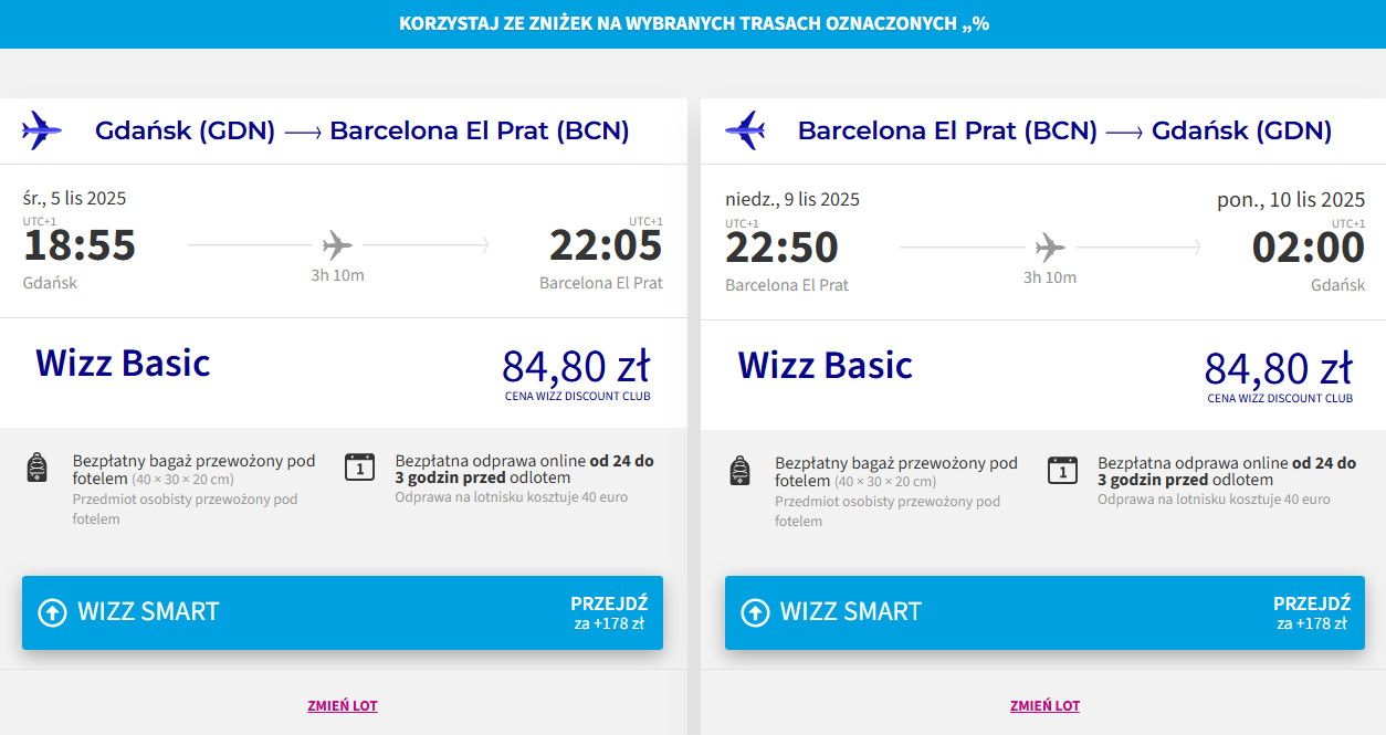Do Barcelony podróżować będziesz bezpośrednio z Gdańska. W obie strony polecisz Wizz Air. Pamiętaj, że bilety w najniższej cenie dostępne są dla członków Wizz Discount Club. Chętni na loty bez WDC 257 PLN.