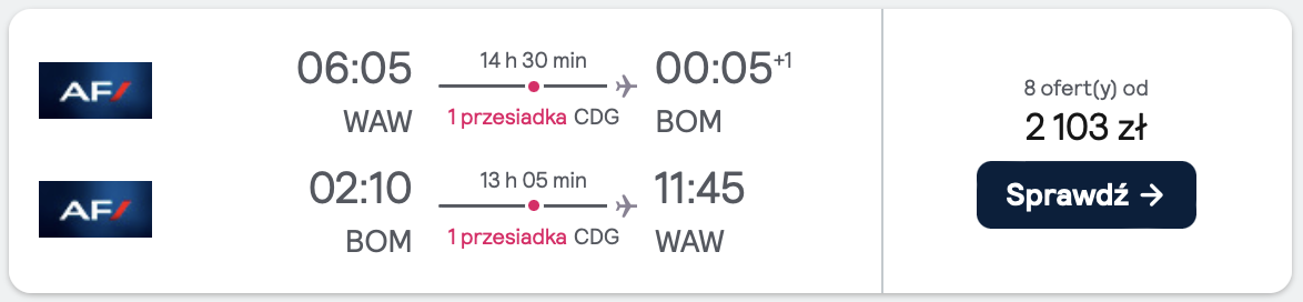 W podróż do Azji możesz wybrać się pomiędzy wrześniem a listopadem. Czekają cię loty z Gdańska lub Warszawy do Bombaju, realizowane na pokładzie samolotów linii lotniczej Air France lub KLM. Po drodze zaplanowano bezpieczne, gwarantowane przez przewoźnika przesiadki w Paryżu lub Amsterdamie.