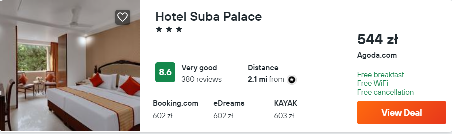 W Bombaju proponuję wam noclegi z codziennymi śniadaniami w 3* hotelu Suba Palace. Wszystkie pokoje wyposażone są w klimatyzację, telewizor LCD, lodówkę i czajnik elektryczny. W łazience jest wanna z prysznicem i suszarka do włosów.
