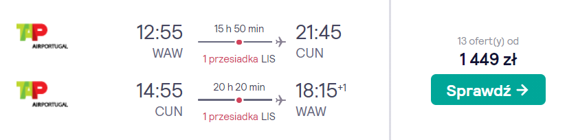 Do Cancun podróżować będziecie z warszawskiego lotniska im. Chopina na pokładzie samolotu linii TAP Air Portugal z wygodnymi przesiadkami w Lizbonie. W cenie biletu zabrać ze sobą będziecie mogli bagaż podręczny oraz przedmiot osobisty (mały plecak lub damską torebkę).