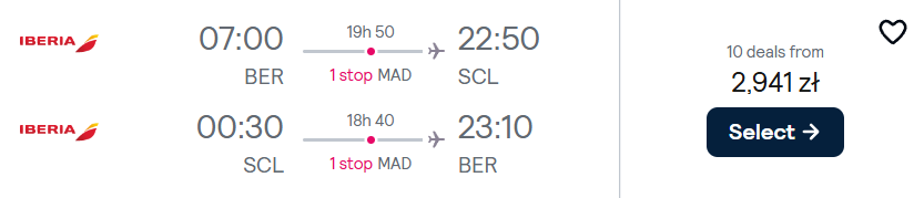 Do Santiago de Chile polecisz z Berlina. Dostępnych jest wiele terminów od marca do maja przyszłego roku. W obie strony podróżować będziesz linią lotniczą Iberia, z przesiadkami w Madrycie. W cenie biletu zabrać ze sobą możesz bagaż podręczny i przedmiot osobisty.