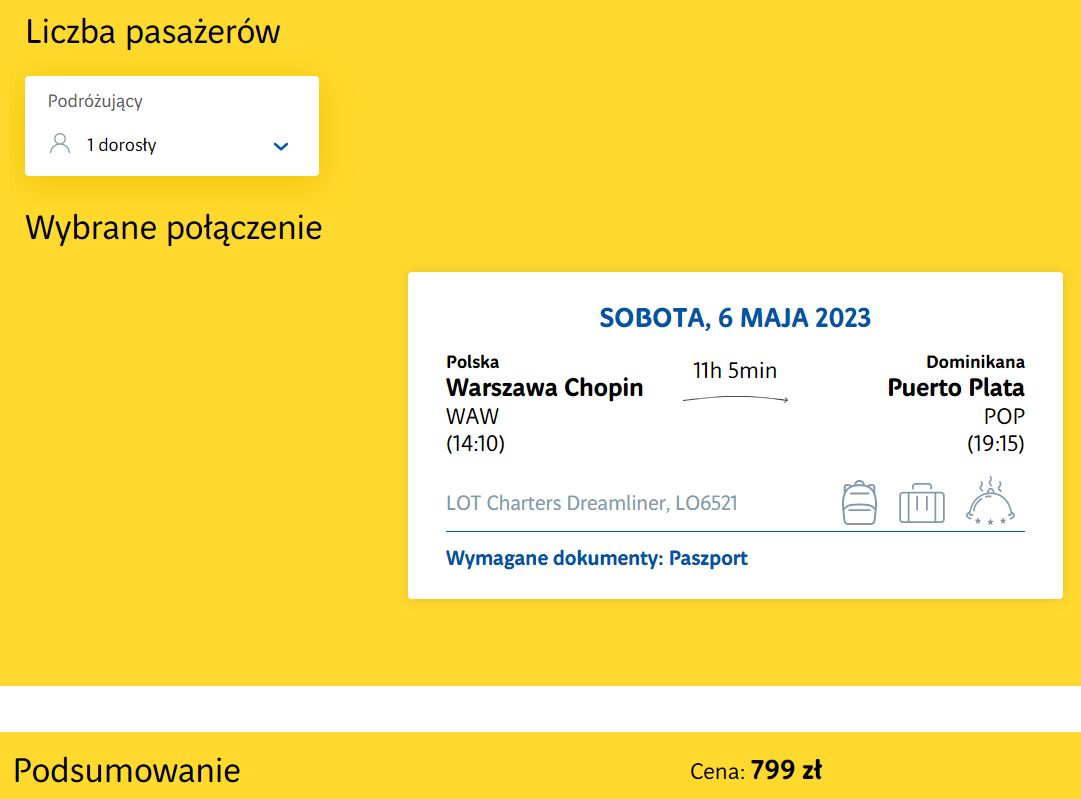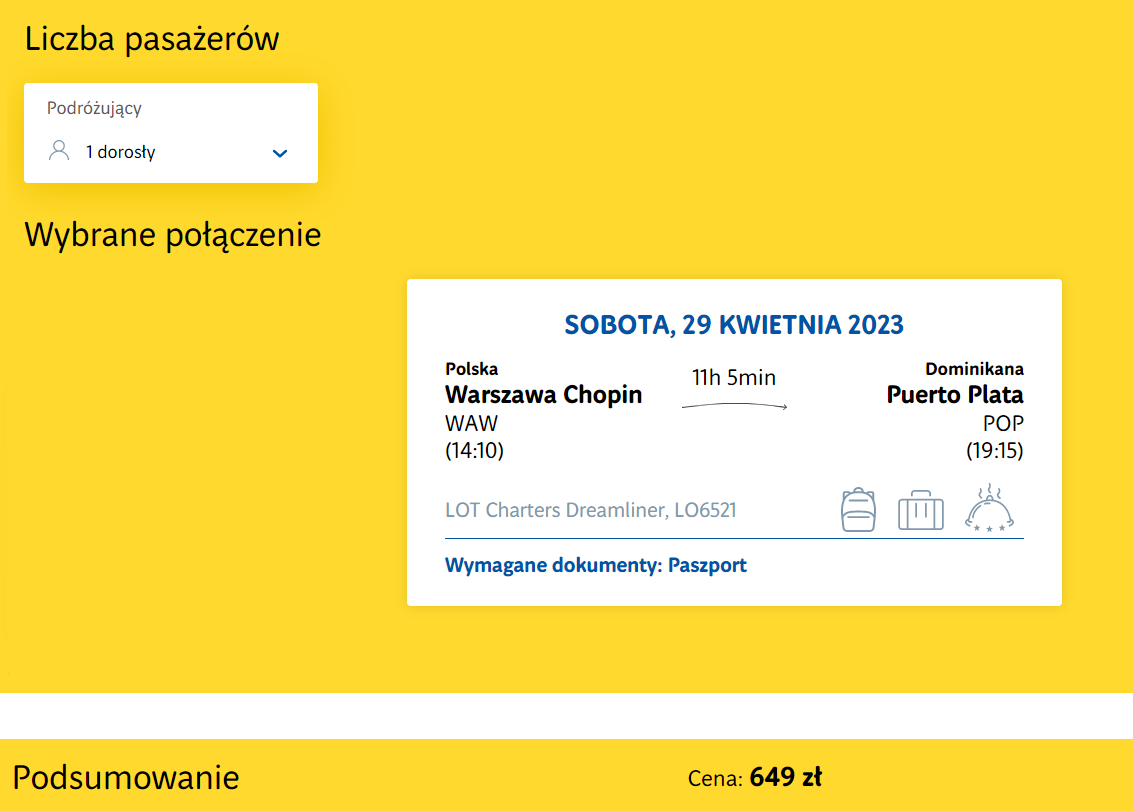 Do Dominikany wybrać się możesz z katowickiego lotniska w Pyrzowicach oraz warszawskiego portu lotniczego im. Fryderyka Chopina. Do Puerto Plata polecisz na pokładzie samolotu Boeing 787 Dreamliner należącego do Polskich Linii Lotniczych LOT. W cenie biletu zabrać ze sobą możesz bagaż rejestrowany (nadawany do luku) oraz podręczny.