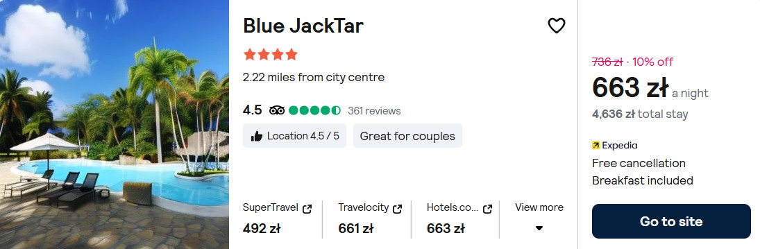 Możesz także zatrzymać się w 4* hotelu Blue JackTar, który znajduje się nieopodal plaży Playa Dorada. Na terenie obiektu mieści się odkryty basen. W cenie zapewniony będziesz miał dostęp do sieci WiFi oraz codzienne śniadania