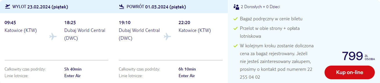 Do Dubaju wybrać się możesz z portu lotniczego Katowice-Pyrzowice oraz z wrocławskiego lotniska im. Mikołaja Kopernika. W obie strony polecisz bezpośrednio czarterową linią Enter Air. W cenie zabrać ze sobą możesz bagaż podręczny.
