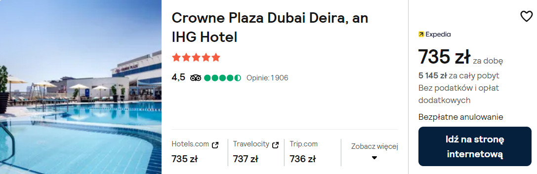 Jesteś w stanie wydać więcej na zakwaterowanie? W takim razie rozważ pobyt w 5* hotelu Crowne Plaza Dubai Deira. Każdy pokój wyposażony jest w klimatyzację, minibar, telewizor LCD oraz czajnik elektryczny. W łazience jest prysznic, suszarka do włosów oraz podstawowe przybory toaletowe.
