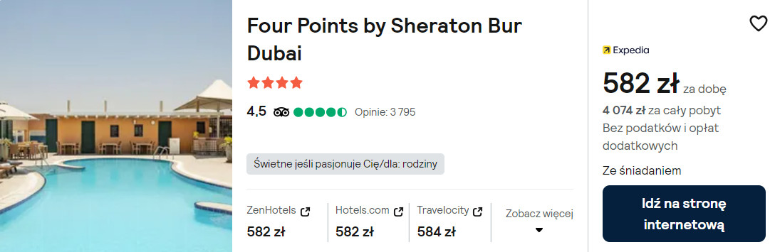 Możesz także zatrzymać się w 4* hotelu Four Points by Sheraton Bur Dubai, który posiada odkryty basen na dachu. W cenę zakwaterowania wliczony jest bezpłatny transport do centrum handlowego Dubai Mall oraz na plaże La Mer (szczegóły znajdziesz na recepcji).