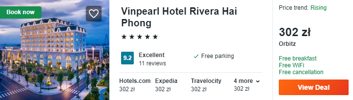 W Haiphong polecam wam noclegi w 5* hotelu Vinpearl Rivera. Dotychczasowi goście bardzo dobrze oceniają pobyt w tym miejscu. Wnętrze jest bardzo luksusowo wykończone. Będziecie mogli skorzystać z basenu i siłowni. Otrzymacie też darmowe śniadania.