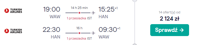 Do Hanoi polecicie w marcu lub kwietniu, na przykład w terminie 22–30 marca. Czekają was loty z lotniska im. Fryderyka Chopina w Warszawie, realizowane na pokładzie samolotów linii lotniczych Turkish Airlines. Po drodze spodziewajcie się przesiadek w Stambule.