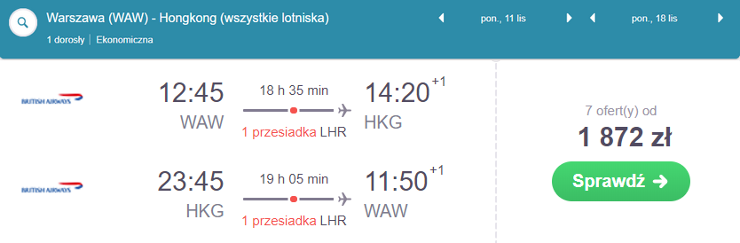 Loty British Airways do Hongkongu z Warszawy za 1872 PLN