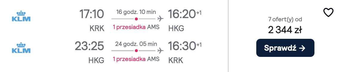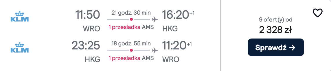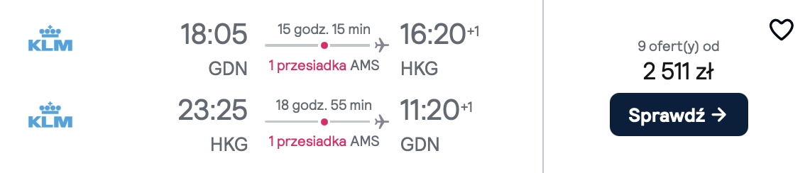 Do Hongkongu wybrać się możesz z jednego z 5 lotnisk w Polsce, w terminach pomiędzy listopadem a styczniem. W obie strony polecisz linią lotniczą KLM z przesiadkami w Amsterdamie. W cenie zabierzesz ze sobą bagaż podręczny oraz przedmiot osobisty (mały plecak lub damską torebkę).