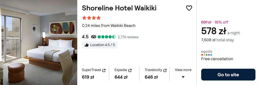 Niewiele więcej zapłacisz za pobyt w 4* hotelu Shoreline Waikiki, który od plaży Waikiki oddalony jest o 5 minut spokojnego spaceru. Na miejscu zapewniony będziesz miał dostęp do sieci WiFi oraz odkrytego basenu.