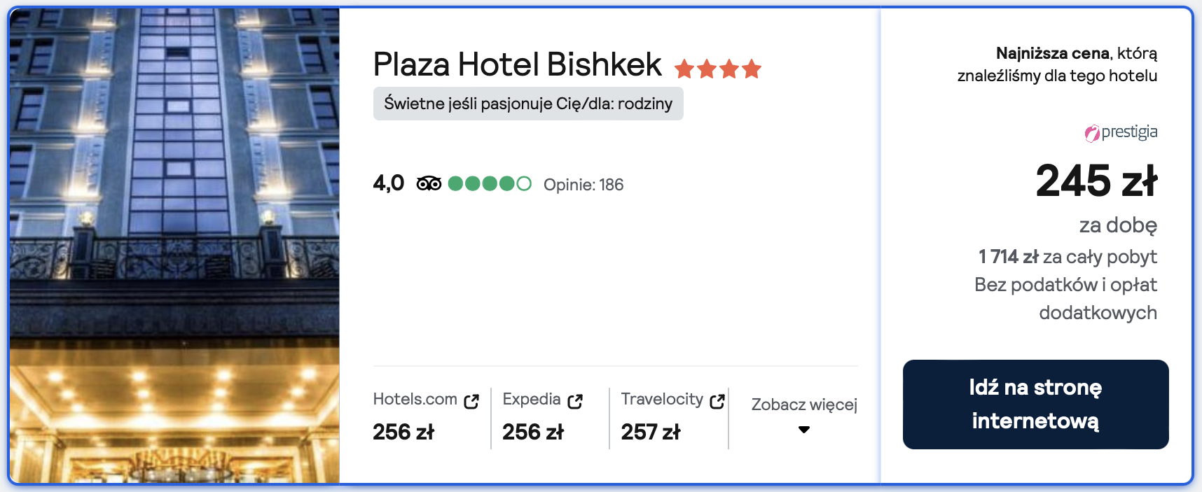 W Biszkeku polecam noclegi w 4* Plaza Hotel. Każdy pokój wyposażony jest w klimatyzację z funkcją ogrzewania, WiFi, telewizor i prywatną łazienkę z bezpłatnym zestawem kosmetyków.