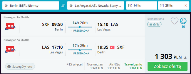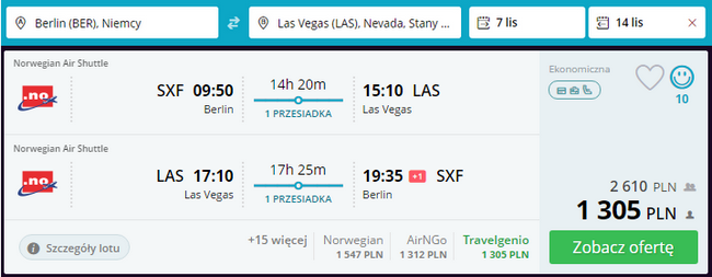 - Loty do Las Vegas (7 – 14 listopada) za 2610 PLN/2 osoby (1305 PLN/osoba)