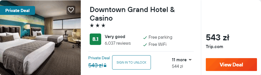 W Las Vegas proponuję wam noclegi w 3* Downtown Grand Hotel & Casino, który znajduje się w samym sercu miasta. W cenie pobytu zapewniony będziecie mieć dostęp do sieci WiFi, parkingu, centrum fitness oraz odkrytego basenu.