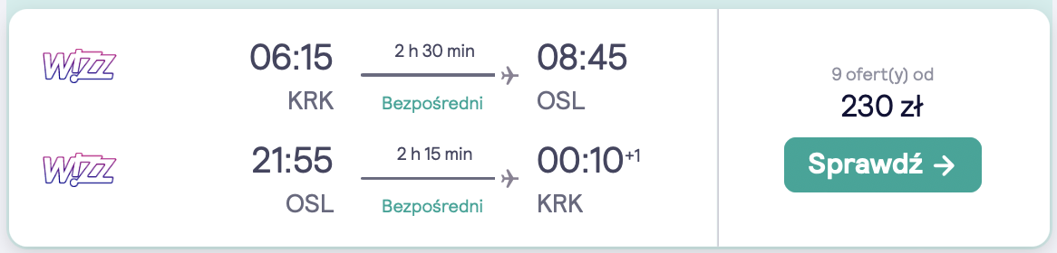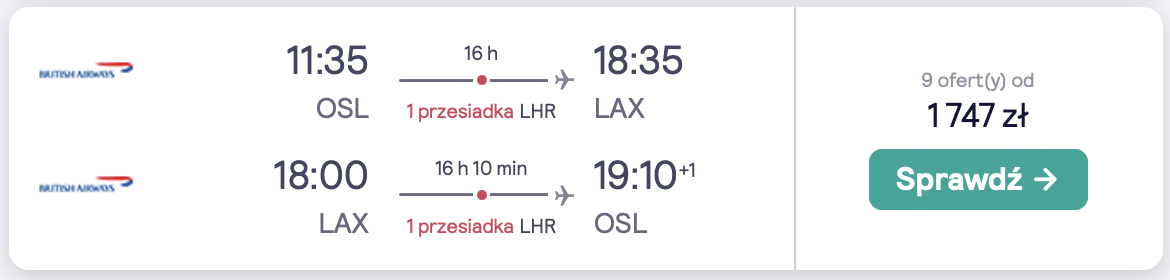 Pierwszym etapem jest lot na trasie Kraków – Oslo – Kraków. W obie strony polecisz na pokładach samolotów linii Wizz Air. Natomiast z Oslo do Los Angeles i z powrotem podróżować będziesz liniami American Airlines oraz British Airways. Bez dodatkowych kosztów do Stanów Zjednoczonych zabrać możesz mały bagaż podręczny.
