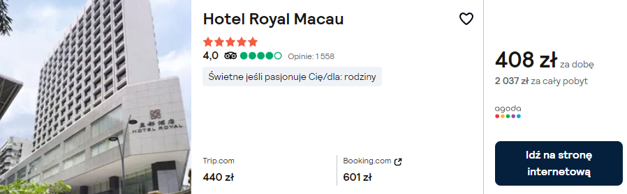 Na miejscu proponuję ci noclegi w 5* hotelu Royal Macau, z krytym basenem. Każdy pokój wyposażony jest w klimatyzację, telewizor LCD, minibar oraz czajnik elektryczny. W łazience jest wanna oraz podstawowe przybory toaletowe.