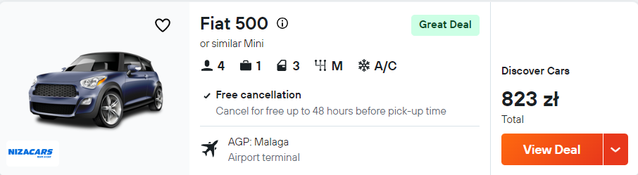 Zachęcam cię do wypożyczenia samochodu po przylocie do Hiszpanii. Mając do własnej dyspozycji auto, łatwo i wygodnie dostaniesz się do miejsca zakwaterowania, na Gibraltar oraz wszystkich ciekawych miejsc Andaluzji.