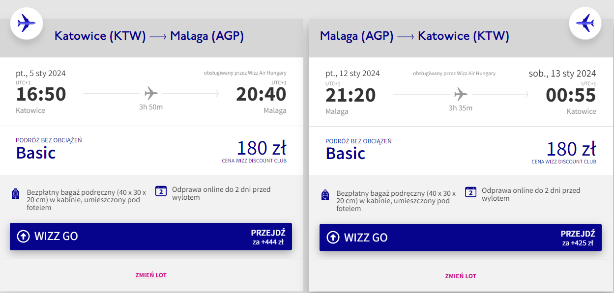W obie strony polecisz bezpośrednio na pokładzie samolotów linii Wizz Air z wliczonym małym bagażem podręcznym. Bilety w najniższej cenie dostępne są dla osób z Wizz Discount Club. Chętni na loty bez WDC zapłacą od 411 PLN (w dwie strony).