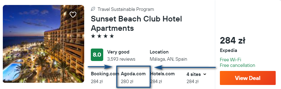 Na Costa del Sol proponuję ci noclegi w 4* hotelu apartamentowym Sunset Beach Club, który znajduje się w odległości 100 metrów od plaży w miejscowości Benalmádena. Na terenie kompleksu mieszczą się 3 baseny, dobrze wyposażone centrum fitness oraz sklep.