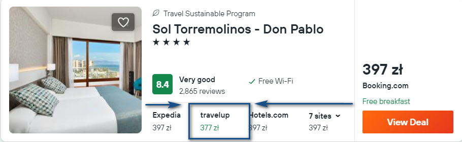 Jeżeli jesteś w stanie wydać nieco więcej na zakwaterowanie, to postaw na pobyt w 4* hotelu Sol – Don Pablo, który mieści się w kurorcie Torremolinos. Obiekt od plaży Bajondillo oddalony jest o jedyne 200 metrów. Na miejscu czekają na ciebie 3 baseny (2 odkryte i 1 kryty). W cenie zapewnione są codzienne śniadania oraz dostęp do sieci WiFi.