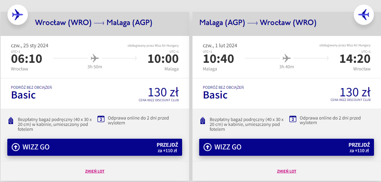 Do Malagi podróżować będziesz z wrocławskiego portu lotniczego im. Mikołaja Kopernika na przełomie stycznia i lutego przyszłego roku. W obie strony polecisz bezpośrednio na pokładzie samolotów linii Wizz Air z wliczonym małym bagażem podręcznym. Bilety w najniższej cenie dostępne są dla członków z Wizz Discount Club. Chętni na loty bez WDC zapłacą od 353 PLN (w dwie strony).