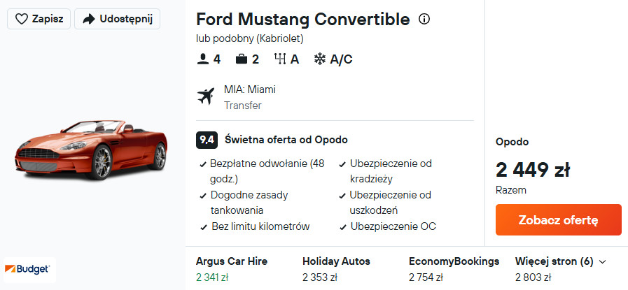 Zachęcam cię wypożyczenia samochodu po przylocie na Florydę. Na przykład za wynajem Forda Mustanga w wersji kabrio lub podobnego modelu zapłacisz od 272 PLN/doba.