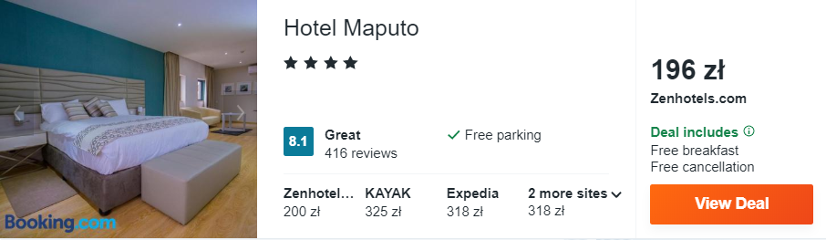 W Maputo rekomenduję wam zakwaterowanie ze śniadaniami w 4* hotelu Maputo.
