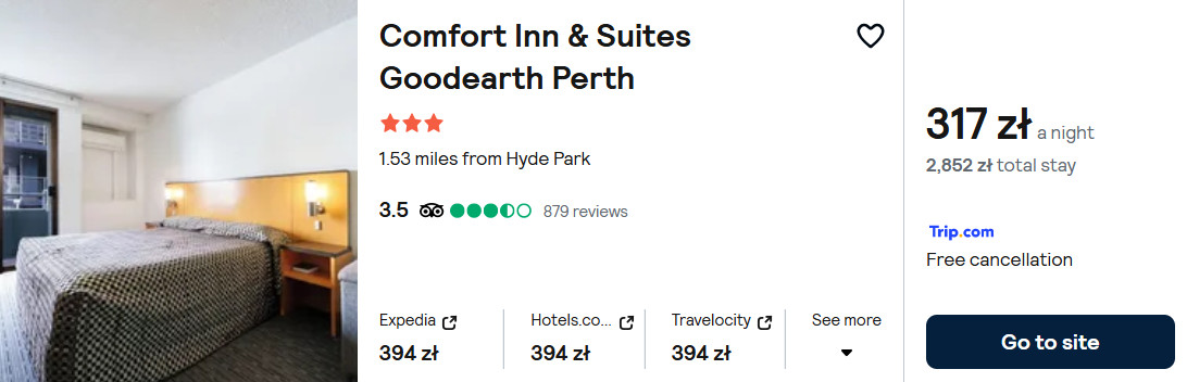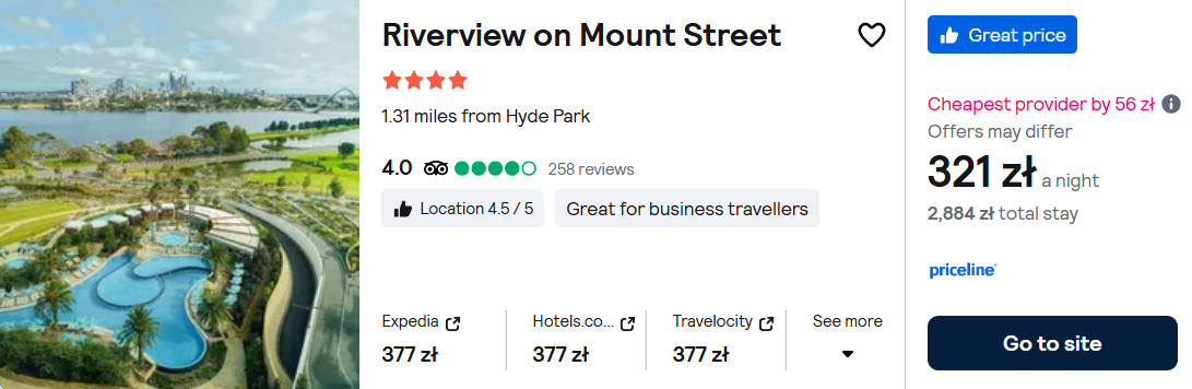 Tylko 4 PLN więcej zapłacisz za pobyt w 4* hotelu Riverview on Mount Street, który znajduje się w sąsiedztwie parku Kings. Także tutaj każde studio składa się z aneksu kuchennego, miejsca do relaksu i spania oraz łazienki. Na miejscu zapewniony będziesz miał dostęp do sieci WiFi.