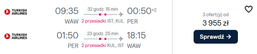Do Australii (Perth) wybierzesz się z warszawskiego portu lotniczego im. Fryderyka Chopina w okresie luty-marzec. W obie strony polecisz linią Turkish Airlines z wygodnymi przesiadkami w Stambule oraz Kuala Lumpur.