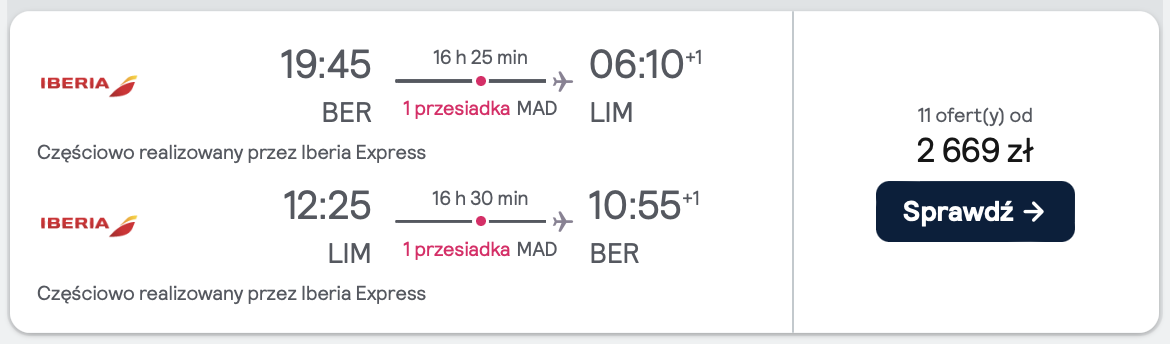 Do Peru polecisz z Berlina w terminach od listopada do marca. Po drodze czekają cię bezpieczne przesiadki w Madrycie. Bez dodatkowych opłat możesz zabrać ze sobą bagaż podręczny i przedmiot osobisty. Podróżować będziesz na pokładzie samolotów linii lotniczych Iberia.