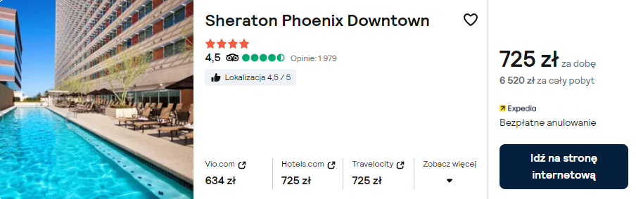 Jeśli szukasz czegoś bardziej komfortowego, to proponuję pobyt w Sheraton Phoenix Downtown. W cenę wliczono codzienne śniadania.