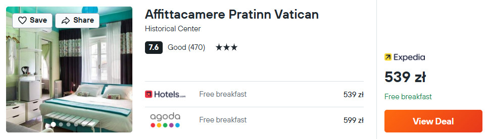 Możesz także zatrzymać się w 3* hotelu Affittacamere Pratinn Vatican, z codziennymi śniadaniami i dostępem do sieci WiFi. Znajduje się on nieopodal stacji metra Ottaviano oraz Watykanu.