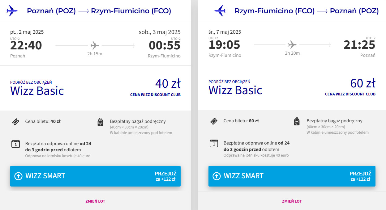 Do Rzymu (lotnisku Fiumicino) udasz się z Poznania w maju. W obie strony podróżować będziesz linią Wizz Air z bagażem podręcznym. Bilety w najniższej cenie dostępne są dla członków Wizz Discount Club. Chętni na loty bez WDC zapłacą 195 PLN (w obie strony).