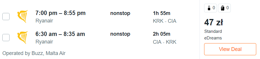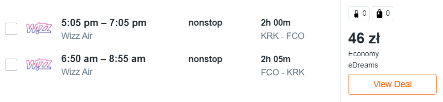 Podróż rozpoczniecie i zakończycie na krakowskim lotnisku w Balicach. Do Rzymu Fiumicino polecicie na pokładach samolotów linii Wizz Air, natomiast do Rzymu Ciampino na pokładach samolotów linii Ryanair. W obu przypadkach bilety za 46 oraz 47 PLN dostępne są dla wszystkich (bez konieczności posiada klubów zniżkowych). Pamiętajcie, że bez dodatkowych kosztów zabrać ze sobą będziecie mogli tylko mały bagaż podręczny.