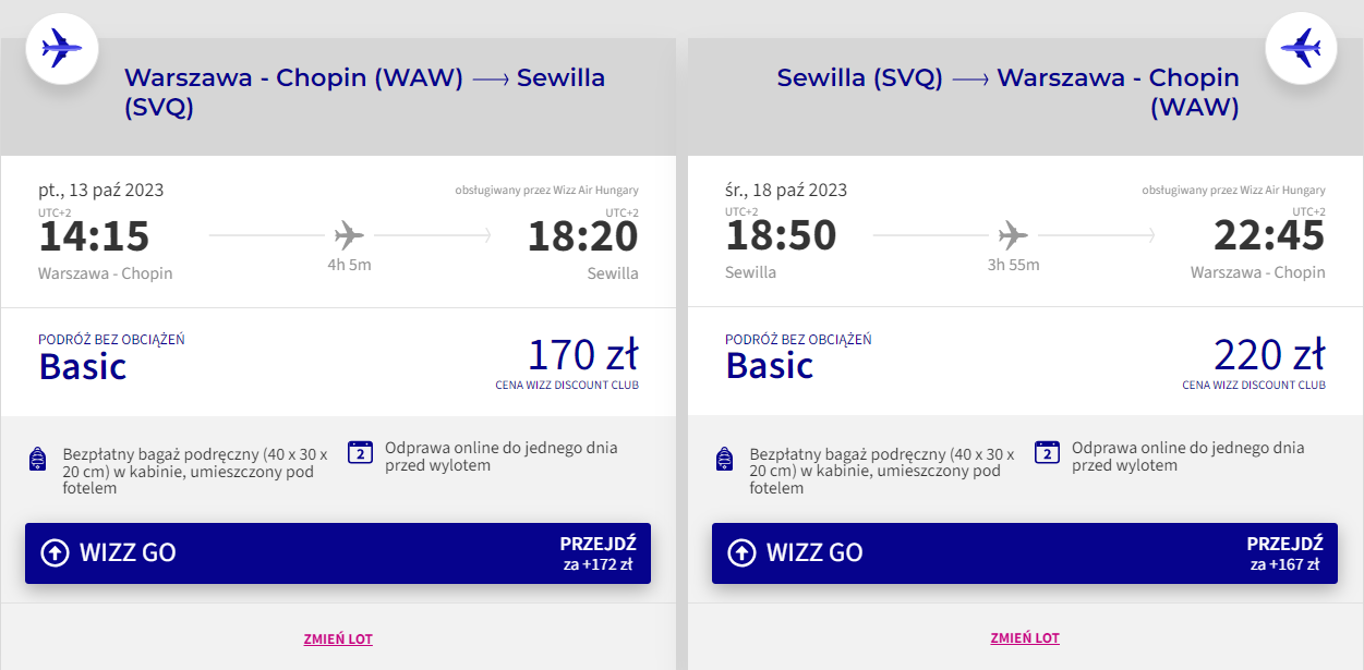 Do Sewilli podróżować będziesz z warszawskiego portu lotniczego im. Fryderyka Chopina w terminie 13-18 października (piątek-środa). W obie strony polecisz bezpośrednio na pokładzie samolotów linii Wizz Air. Bilety w najniższej cenie dostępne są dla członków Wizz Discount Club. Chętni na loty bez WDC zapłacą nieco więcej.