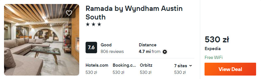 Natomiast w Austin proponuję ci noclegi w 3* hotelu Ramada by Wyndham Austin South. Na miejscu zapewniony będziesz mieć bezpłatny parking oraz dostęp do sieci WiFi.