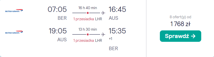 Podróż do Austin rozpoczniecie i zakończycie w porcie lotniczym Berlin Brandenburg. W obie strony polecicie na pokładach samolotów linii American Airlines oraz British Airways, a po drodze czekać was będą wygodne przesiadki na lotnisku w Londynie. Bez dodatkowych kosztów do Teksasu udacie się z bagażem podręcznym oraz przedmiotem osobistym (małym plecakiem lub damską torebką).