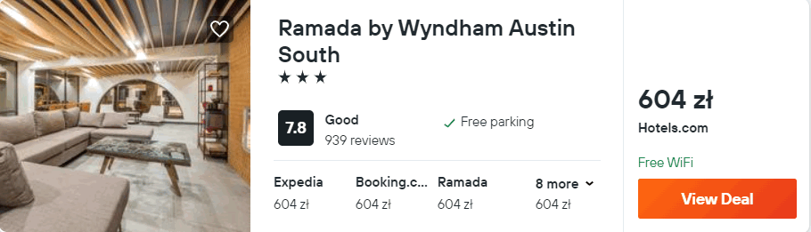 Pierwsze dni po przylocie do Teksasu spędźcie w Austin. Na ten okres rekomenduję wam noclegi w 3* hotelu Ramada by Wyndham Austin South. Na miejscu zapewniony będziecie mieli dostęp do sieci WiFi oraz darmowego parkingu. W każdym pokoju jest klimatyzacja, telewizor, ekspres do kawy, lodówa i łazienka.
