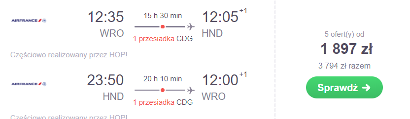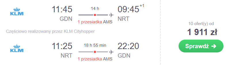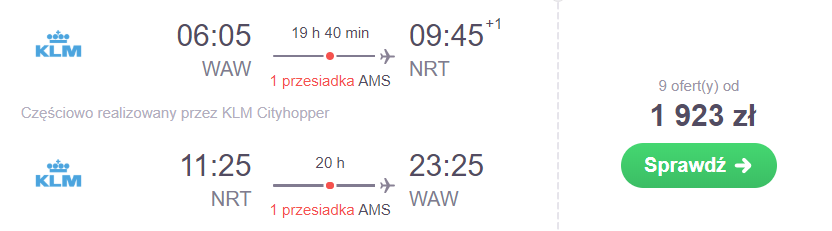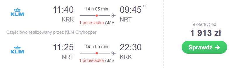 Cena 1939 PLN, liczba terminów oraz możliwość wylotu aż 4 miast to główne zalety oferty lotów do Tokio od KLM/Air France. Podróżując np. w okresie od 3 do 14 grudnia czekają was przesadki na lotniskach w Amsterdamie lub Paryżu. Jeżeli cenie sobie wygodę i czas, to za bezpośredni przelot do stolicy Japonii na pokładach samolotów PLL LOT przyjdzie wam zapłacić 2662 PLN .