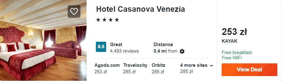 W Wenecji proponuję wam noclegi z codziennymi śniadaniami w 4* hotelu Casanova Venezia, który mieści się tuż przy placu Świętego Marka. Wszystkie pokoje są klimatyzowane i posiadają prywatną łazienkę z prysznicem oraz suszarką do włosów. Na terenie całego obiektu zapewniony będziecie mili dostęp do sieci WiFi.
