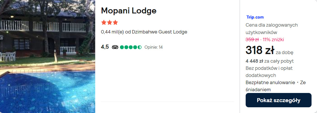 Na miejscu proponuję ci noclegi ze śniadaniami w 3* hotelu Mopani Lodge, który od słynnych wodospadów oddalony jest o nieco ponad 3 km. Wszystkie pokoje są wyposażone w klimatyzację oraz łazienkę z prysznicem. Na terenie obiektu znajduje się odkryty basen. We wszystkich pomieszczeniach będziesz mieć zapewniony dostęp do sieci WiFi.